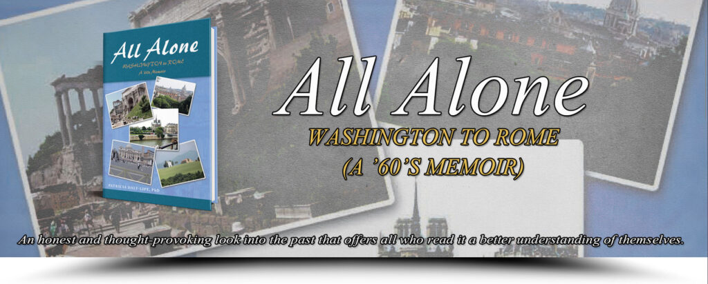 ALL ALONE, From Washington to Rome, a 60s Memoir is an extraordinary memoir that immediately transports the reader to another time and place; a time when art and culture and ideas matter, and a place where beauty and love are natural and innocent. Patricia Daly-Lipe, in a style that is both literary and eloquent, paints a picture of Rome as seen by a young girl coming of age during the ‘60s and left all alone. Her bittersweet memories of the loss of her mother and a failed first love are contrasted by the unbridled joy and wonderment for life she experiences in a foreign country. All ALONE is an honest and thought provoking look into the past that offers all who read it a better understanding of themselves.