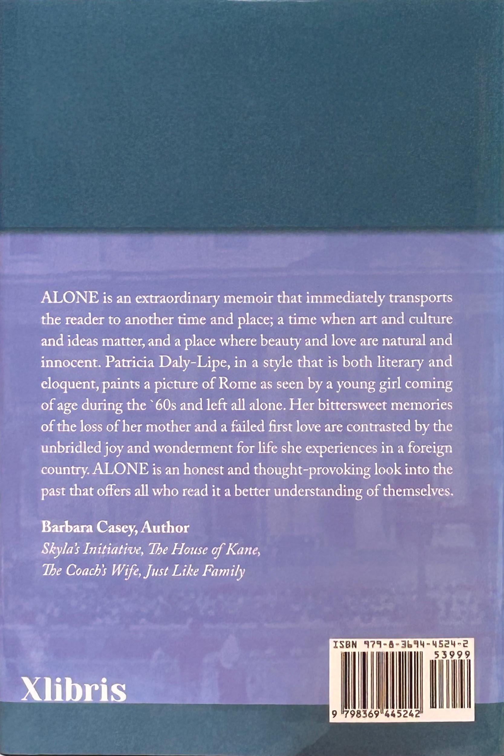 ALL ALONE is an extraordinary memoir that immediately transports the reader to another time and place; a time when art and culture and ideas matter, and a place where beauty and love are natural and innocent. Patricia Daly-Lipe, in a style that is both literary and eloquent, paints a picture of Rome as seen by a young girl coming of age during the `60s and left all alone. Her bittersweet memories of the loss of her mother and a failed first love are contrasted by the unbridled joy and wonderment for life she experiences in a foreign country. ALL ALONE is an honest and thought-provoking look into the past that offers all who read it a better understanding of themselves.